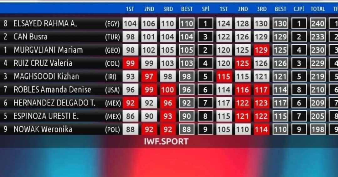 وتوجت اللاعبة بذهبية منافسات الخطف بعد رفع ثقل قدره 110 كجم، وذهبية الكلين والنتر بعد رفع ثقل قدره 130 كجم، لتتوج بذهبية المجموع بإجمالي 240 كجم.