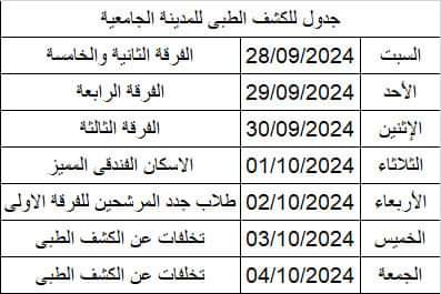 مواعيد إجراء الكشف الطبي لطلاب وطالبات المدن الجامعية بجامعة جنوب الوادي