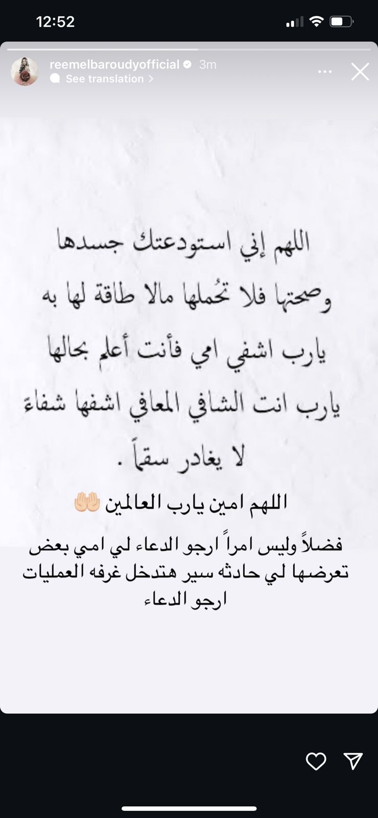 ونشرت ريم البارودي عبر حسابها بخاصية القصص القصيرة بـ موقع تبادل الصور والفيديوهات إنستجرام، صورة دعاء وعلقت عليها قائلة: فضلًا وليس أمرًا أرجو الدعاء لوالدتي بعد تعرضها لحادث سير وهتدخل غرفة العمليات.