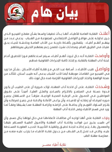 ونوه إلى: أن نقابة أطباء الأقصر بصدد إصدار بيان لتوضيح كل تلك النقاط بشكل محدد، ونلتزم بكل ما ورد في بيان النقابة العامة لأطباء مصر، وما ستسفر عنه تحقيقات لجنة آداب المهنة.