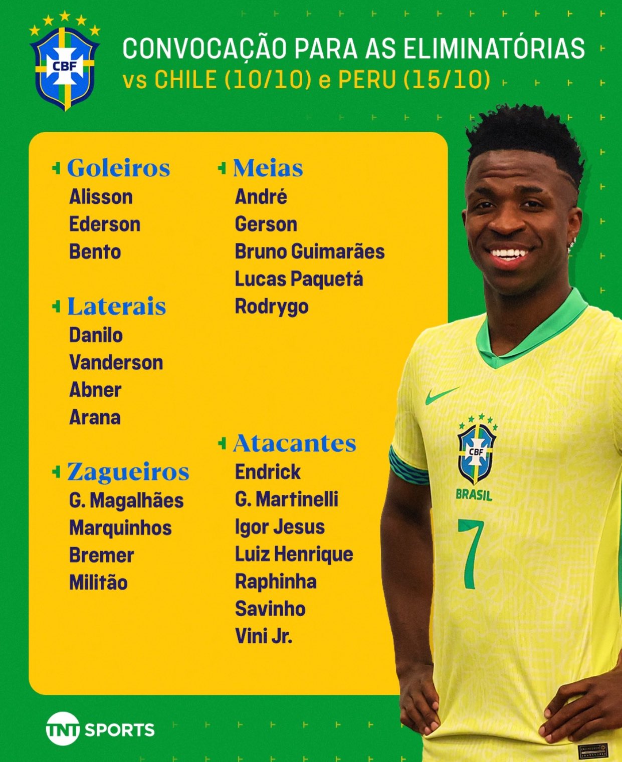 أسدل الستار عن قائمة منتخب البرازيل الرسمية المستدعاه لمواجهتي لمواجهة تشيلي وبيرو في تصفيات أمريكا الجنوبية المؤهلة لـ بطولة كأس العالم 2026.