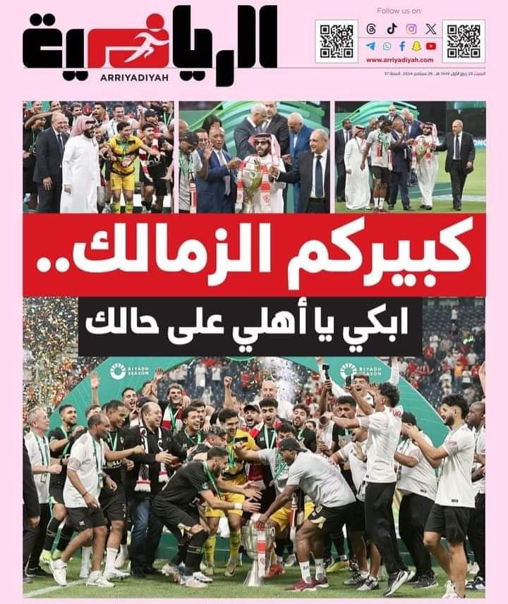 قالت صحيفة الرياض، إن الزمالك قهر الأهلي، وحقق كأس السوبر الإفريقي 2024 في الرياض، ليتوج الفارس الأبيض بلقبه الخامس ويخسر الأهلي لقبه العاشر.
