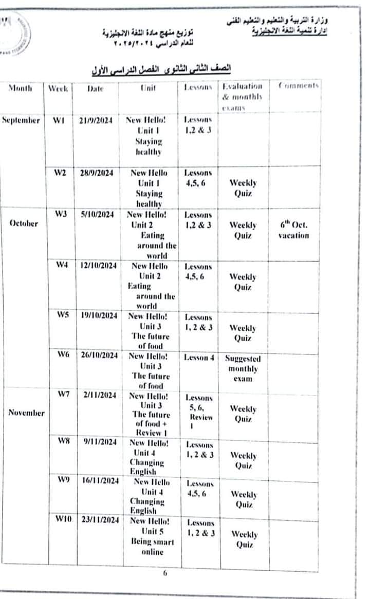 وجاء توزيع منهج اللغة الإنجليزية لطلاب الصف الثاني الثانوي العام الدراسي الجديد، على النحو التالي: