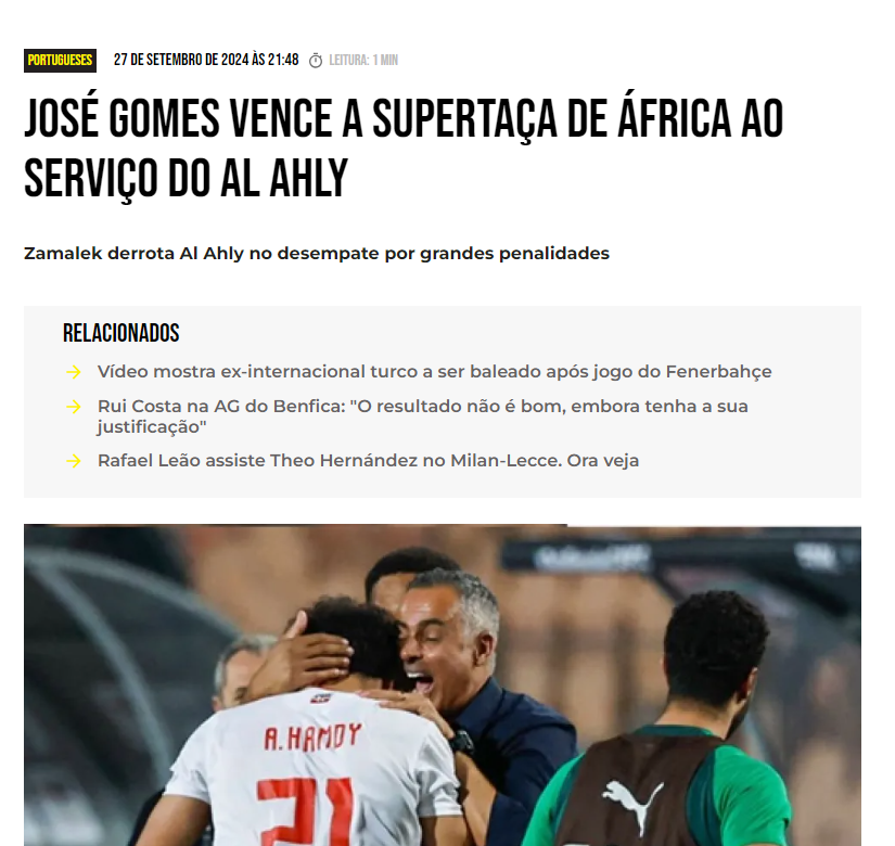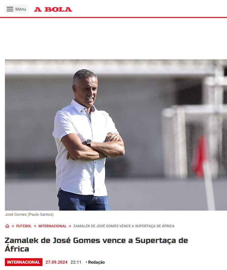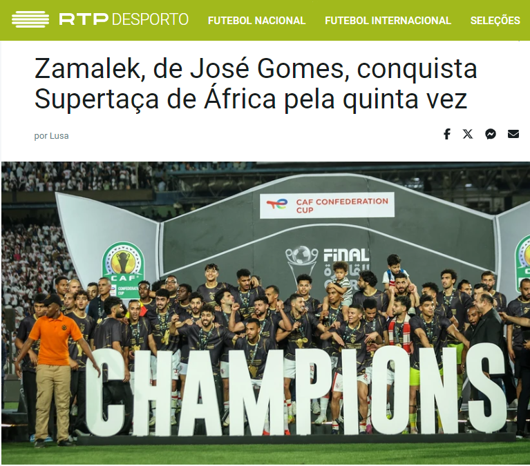 أبرزت الصحف البرتغالية إنجاز المدير الفني لنادي الزمالك جوزيه جوميز، بعد الفوز ببطولة السوبر الإفريقي على حساب النادي الأهلي.