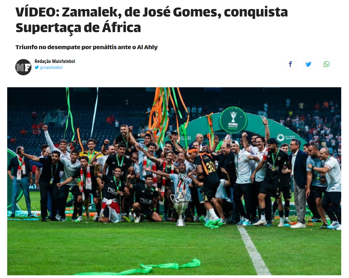 وفي الوقت ذاته، نشر الموقع الرسمي للاتحاد البرتغالي لكرة القدم، رسالة تهنئة من رئيس الاتحاد فرناندو جوميز إلى مدرب الأبيض قائلا: أهنئ جوزيه جوميز على فوزه بكأس السوبر الإفريقي مع نادي الزمالك.