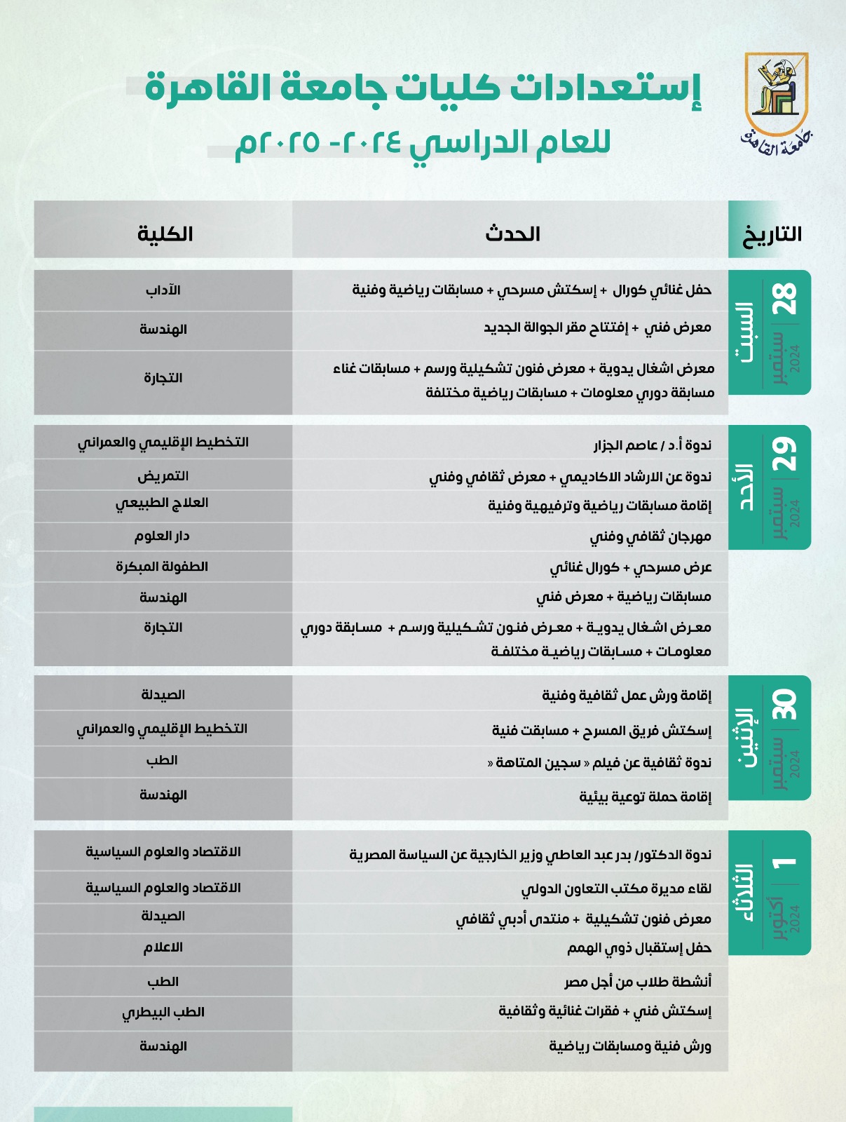 جامعة القاهرة تعلن عن إقامة فعاليات ثقافية ورياضية خلال الأسبوع الأول للدراسة