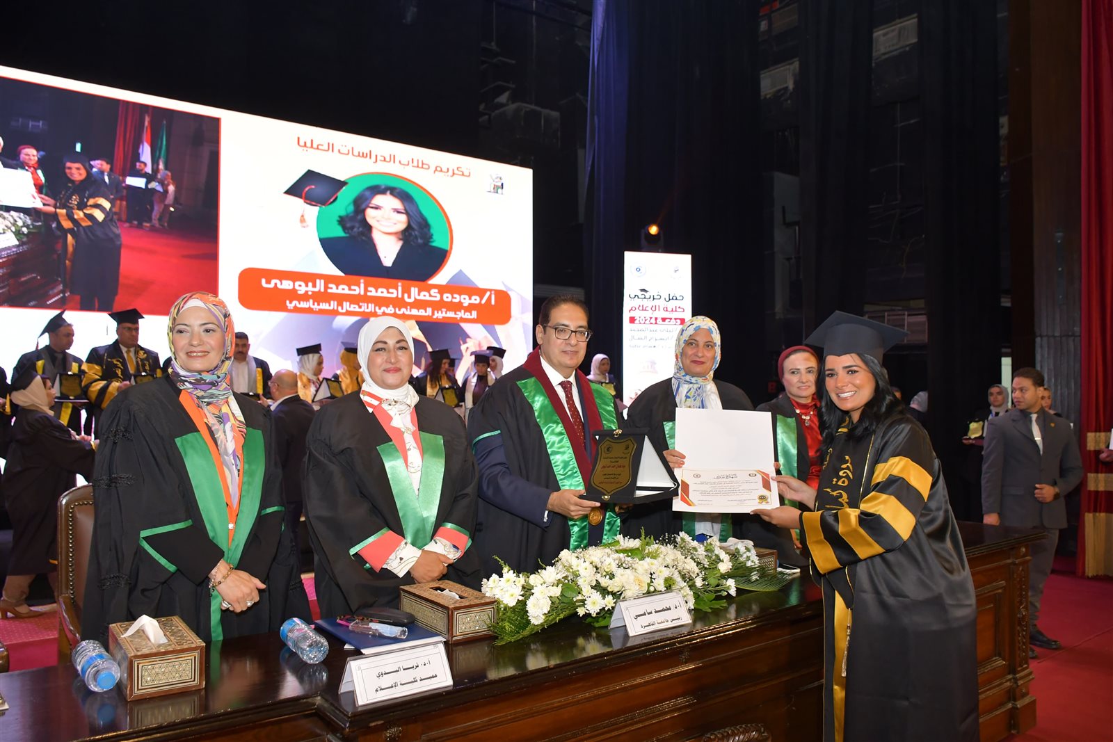 كما تم تكريم أساتذة الكلية، الفائزين بجوائز الجامعة والدولة وهم: الدكتورة ليلى عبد المجيد (جائزة الجامعة للتميز العلمي، والدكتور حسن عماد مكاوي (جائزة الدولة التقديرية في العلوم الاجتماعية)، والدكتور سامي عبدالعزيز - جائزة الدولة التقديرية في العلوم الاجتماعية، وخلال الاحتفالية تم تكريم خالد البلشي نقيب الصحفيين.