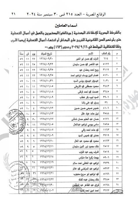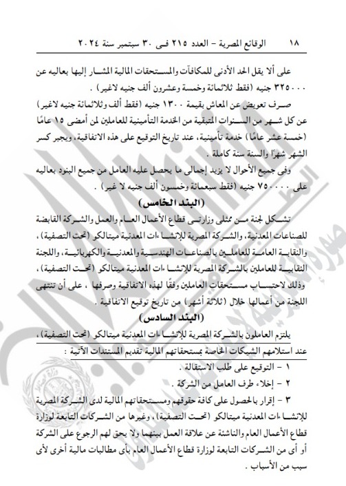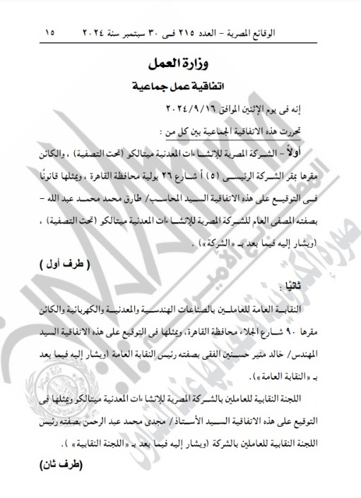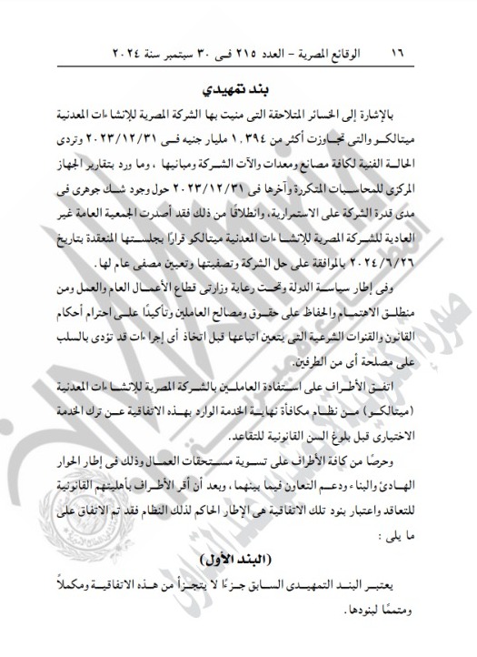 وأضافت الجريدة الرسمية، أن الطرف الثاني هو النقابة العاملة للعاملين بالصناعات الهندسية والمعدنية والكهربائية والكائن مقرها 90 سارع الجلاء محافظة القاهرة، مشيرة إلى أن الخسائر المتلاحقة التي منيت بها الشركة المصرية للإنشاءات المعدنية ميتالكو والتي تجاوزت أكثر من 1.394 مليار جنيه في 31-12-2023 وتردي الحالة الفنية لكافة المصانع والمعدات والآت الشركة ومبانيها.