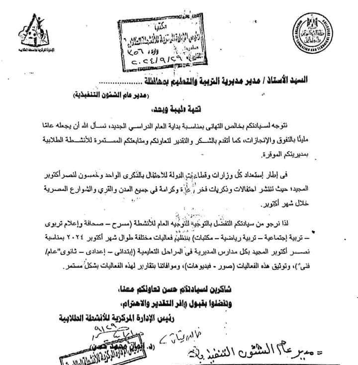 وشددت الوزارة، على التوجيه العام للأنشطة (مسرح - صحافة وإعلام تربوي - تربية اجتماعية - تربية رياضية - مكتبات بتنظيم فعاليات مختلفة طوال شهر أكتوبر 2024 بمناسبة نصر أكتوبر المجيد بكل مدارس المديرية في المراحل التعليمية ابتدائي - إعدادي - ثانوى " عام فني")، وتوثيق هذه الفعاليات بالصور والفيديوهات، وموافاتنا بتقارير لهذه الفعاليات بشكل مستمر.