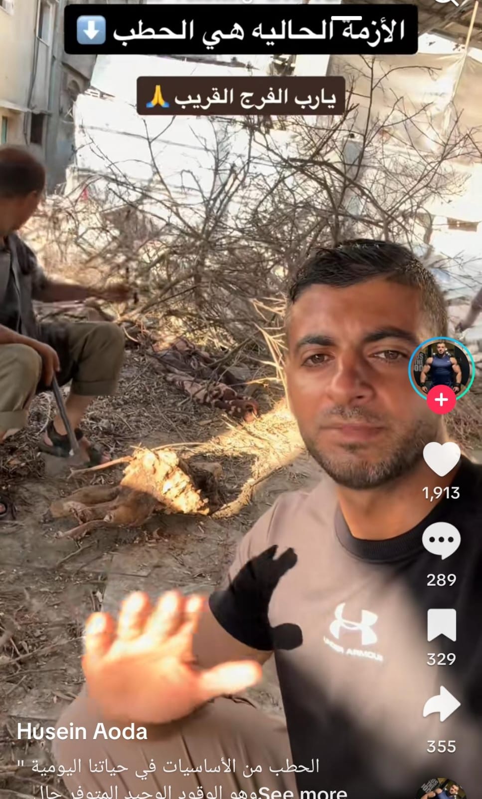 وفي فيديو ظهر فيه مواطن فلسطيني، تحدث عن ندرة الأخشاب في غزة قائلًا: والله ياجماعة الخير إحنا داخلين على أزمة، إحنا بالأساس عندنا مشكلة في الغاز، وبنستخدم الحطب، واليوم الحطب بدأ يشطب، لدرجة أنه وصلنا لمرحلة أننا نستخدم القش، اللي عامل زي الحطب ده اللي أصبحنا نستخدمه، واليوم بنستخدم القش اللي يشبه الحطب عشان نشعل الفرن، وكلنا بنلم القش عشان نشغل الفرن.