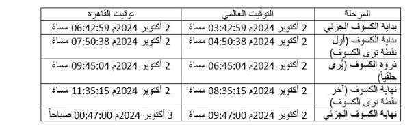 وفيما يلي ننشر أوقات المراحل المهمة في هذا الكسوف، وهي كالتالي: