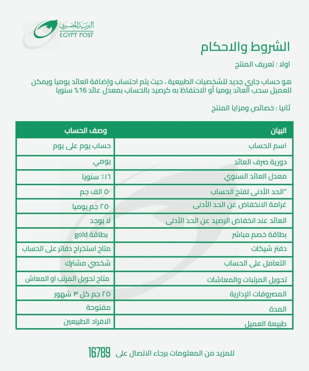 وفيما يخص فوائد البريد المصري 2024، فإن الهيئة القومية للبريد المصري، أعلنت عبر موقعها الإلكتروني عن طرح حساب جديد «يوم على يوم»، يكون بفائدة تراكمية سنوية 16%، ويكون ذلك ضمن الحساب الجاري، حيث يتم احتساب وإضافة العائد يوميًا، على أن يقوم العميل سحب العائد بشكل يومي، ويمكن الاحتفاظ به في الحساب بمعدل عائد سنوي.