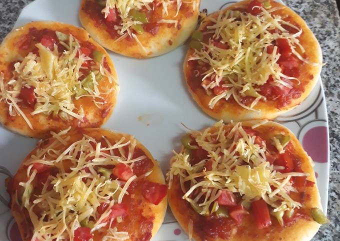 - يوضع الصوص على الميني بيتزا ويتم تزيينها بقطع من الخضروات أو اللحمة المفرومة.