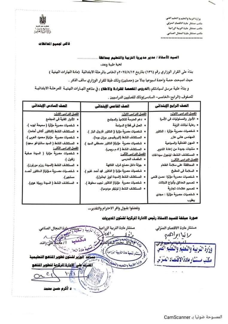 وقالت الوزارة خلال خطاب عممته على كافة المديريات، إنه بناءً على القرار الوزاري رقم 136 بتاريخ 12/ 8/ 2024، والخاص بالمرحلة الابتدائية مادة المهارات المهنية، فقد أصبحت حصة واحدة أسبوعيا بدلا من حصتين، متابعةً: مرسل الدروس المخصصة للقراءة والاطلاع، في مناهج المهارات المهنية للمرحلة الابتدائية، والتي جاءت كالتالي: