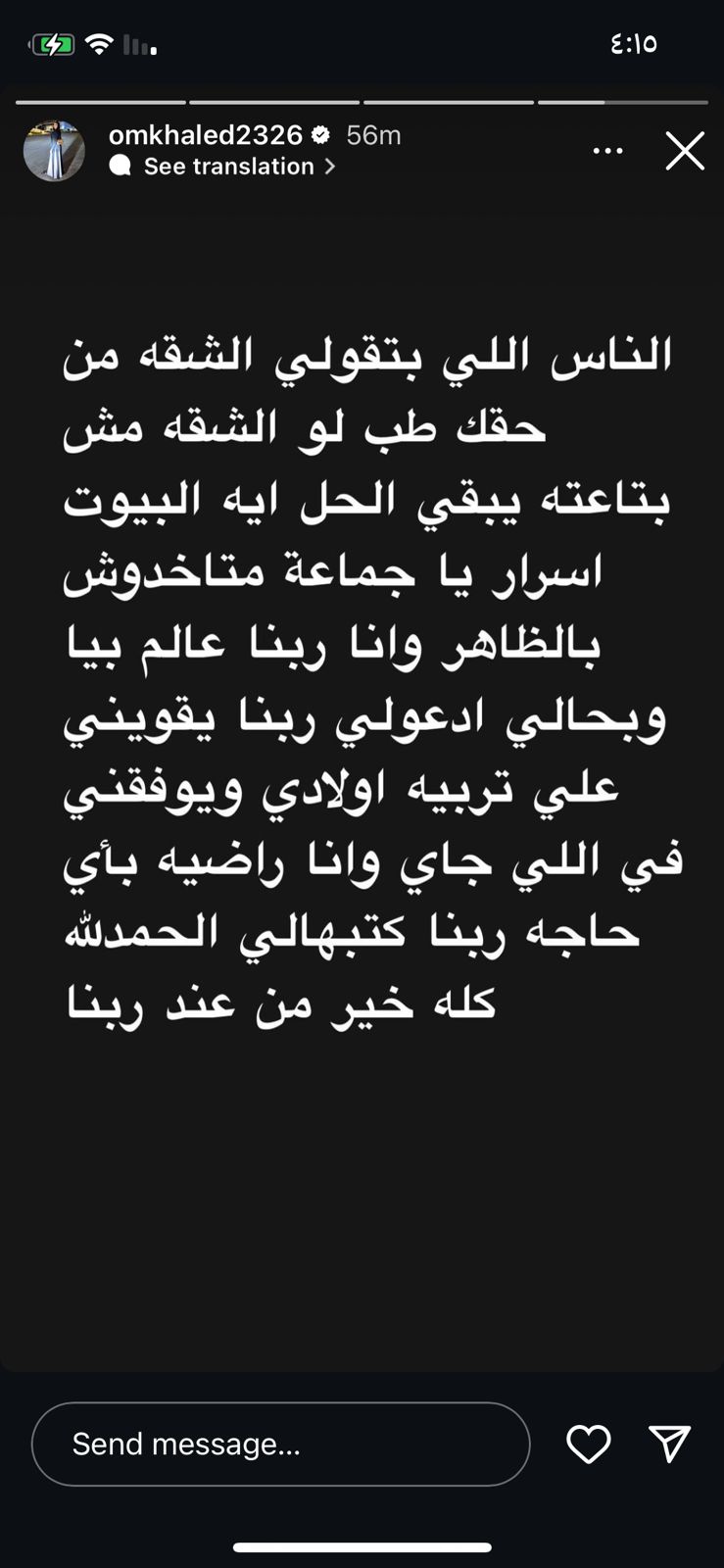 وتابعت أم خالد: البيوت أسرار يا جماعة متاخدوش بالظاهر وأنا ربنا عالم بيا وبحالي ادعولي ربنا يقويني على تربية أولادي ويوفقني في اللي جاي، وأنا راضية بأي حاجة ربنا كتبهالي، الحمد لله كله خير من عند ربنا.
