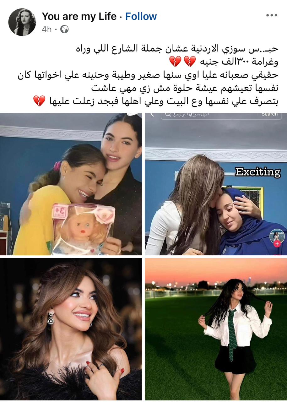 وتداول منشور على منصة فيسبوك للتواصل الاجتماعي، يحمل صورا لـ سوزي الأردنية مع شقيقتها مي من ذوي الهمم، وأسرتها، بكلمات مؤثرة: حقيقي صعبانة عليا أوي، سنها صغير وطيبة وحنينة على إخواتها، وكان نفسها تعيشهم عيشة حلوة مش زي ما هي عاشت، بتصرف على نفسها وعلى البيت وعلى أهلها، زعلت عليها أوي.