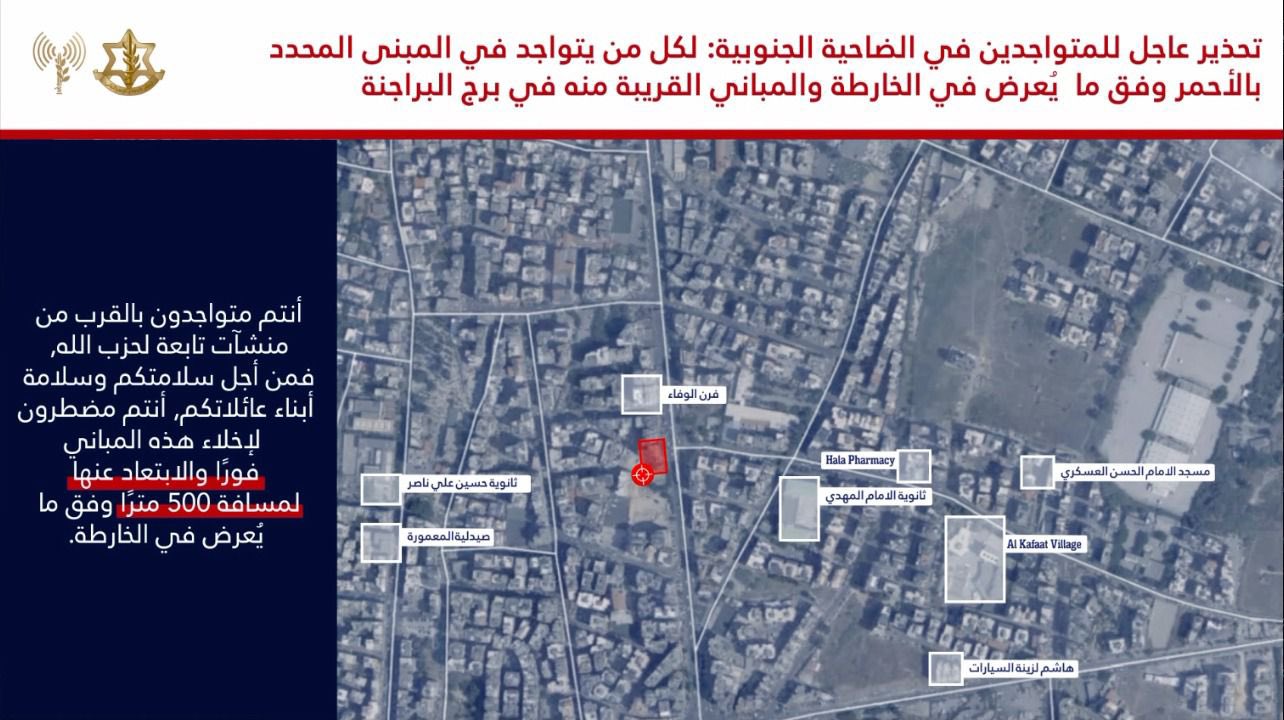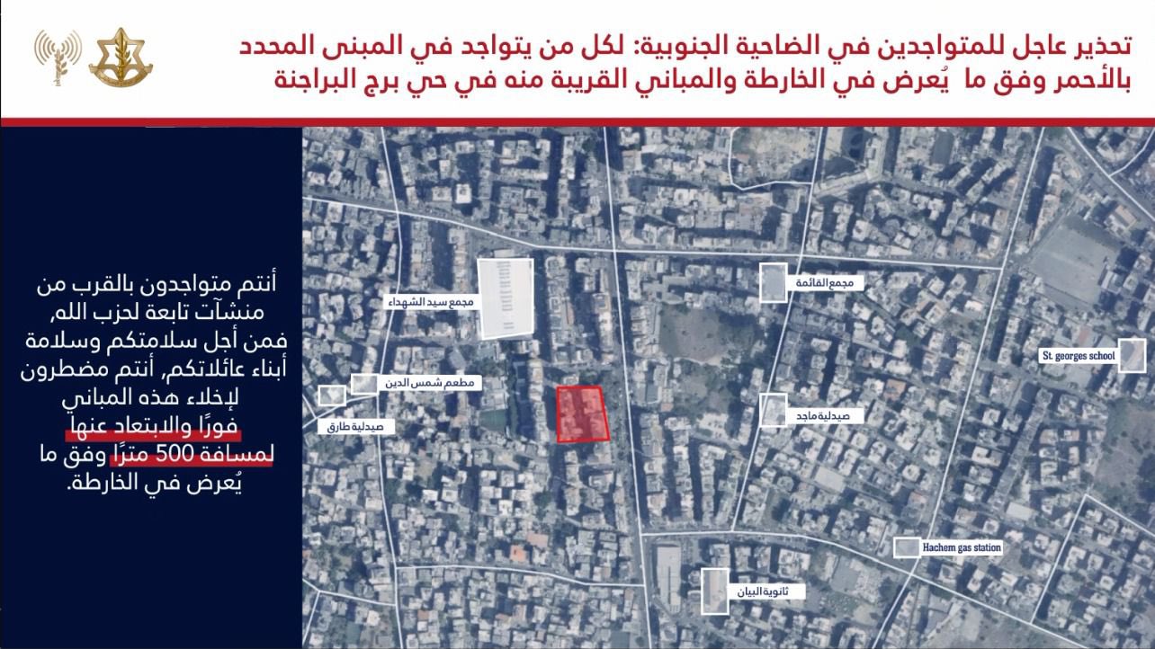 وأوضحت صحيفة يديعوت أحرونوت، أن المتحدث باسم جيش الاحتلال، وجه إنذار عاجل إلى سكان الضاحية الجنوبية وتحديدًا الموجودين في المباني المحددة في الخريطتين والواقعتين في حي برج البراجنة.