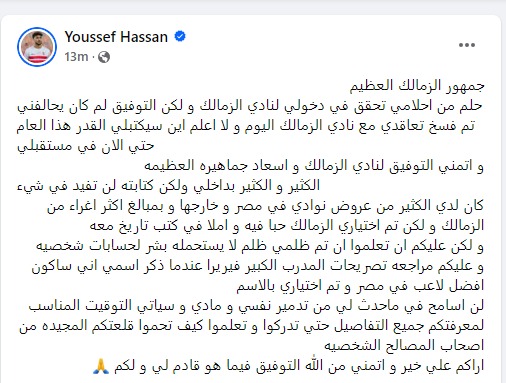وكتب يوسف حسن عبر حسابه الرسمي على فيس بوك: جمهور الزمالك العظيم، حلم من أحلامي تحقق في دخولي لنادي الزمالك، ولكن التوفيق لم كان يحالفني.