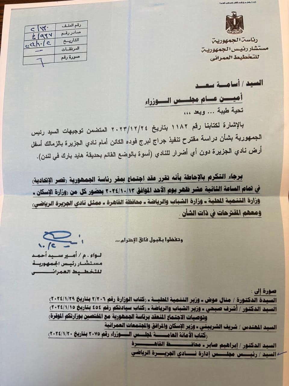 وأوضحت الدعوى الموجهة إلى وزارات: الإسكان والتنمية المحلية والشباب والرياضة، ومحافظة القاهرة ونادي الجزيرة الرياضي، أنه سيتم عقد الاجتماع بقصر الاتحادية يوم 13 أكتوبر الجاري، لمناقشة مقترحاتهم حول تنفيذ جراج لبرج فودة، أسفل أرض نادي الجزيرة، دون أي أضرار للنادي، أسوة بالوضع القائم بحديقة هايد بارك في لندن"، بحسب الوثيقة.
