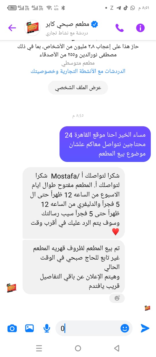 القاهرة 24 يتواصل مع الصفحة الرسمية لمطعم صبحي كابر