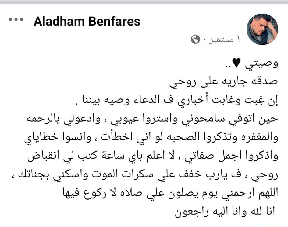 وأشار صديق المتوفى إلى أنه كتب على صفحته على الفيس بوك ما يدل على أنه توقع قرب أجله، ومن تلك الكلمات التي عصرت قلوب المحبين "صدقة جارية على روحي، إن غِبت وغابت أخباري فالدعاء وصية بيننا، وحين اتوفي سامحوني واستروا عيوبي، وادعولي بالرحمة والمغفرة وتذكروا الصحبة لو أني أخطأت، وانسوا خطاياي واذكروا أجمل صفاتي، لا أعلم بأي ساعة كتب لي انقباض روحي، فيارب خفف علىّ سكرات الموت واسكني بجناتك، اللهم ارحمني يوم يصلون علىّ صلاة لا ركوع فيها".