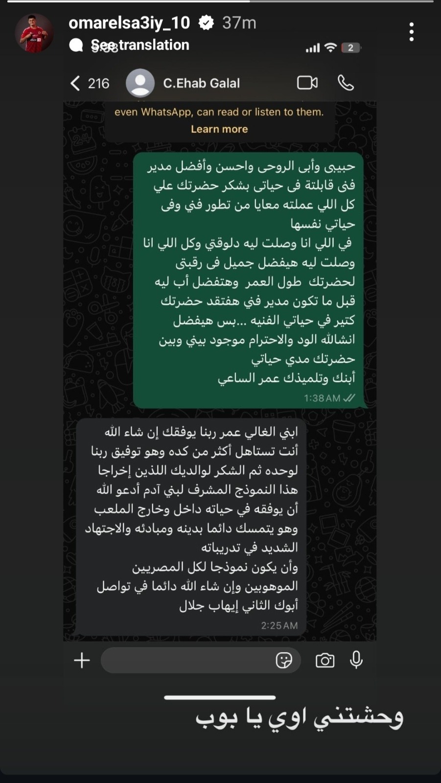 نشر عمر الساعي مهاجم فريق الأهلي، على حسابه الشخصي إنستجرام، صورة تظهر فيها محادثة بينه وبين الراحل إيهاب جلال المدير الفني السابق لفريق الإسماعيلي على واتس آب.