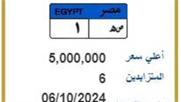 أعلى سعر للتزايد: 5 ملايين جنيه.