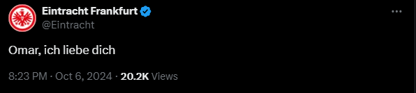 وكتب الحساب الرسمي لفريق آينتراخت فرانكفورت عبر موقع التواصل الاجتماعي إكس: عمر أنا أحبك.