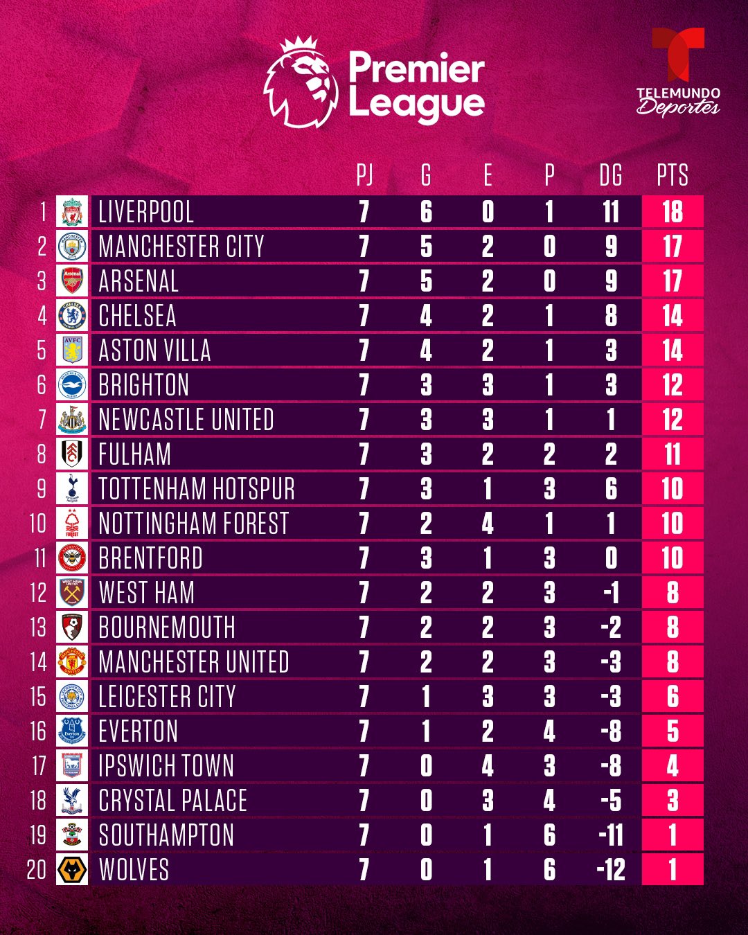 وجاء جدول ترتيب الدوري الإنجليزي الممتاز بعد الانتهاء من الجولة السابعة على الشكل التالي:ـ