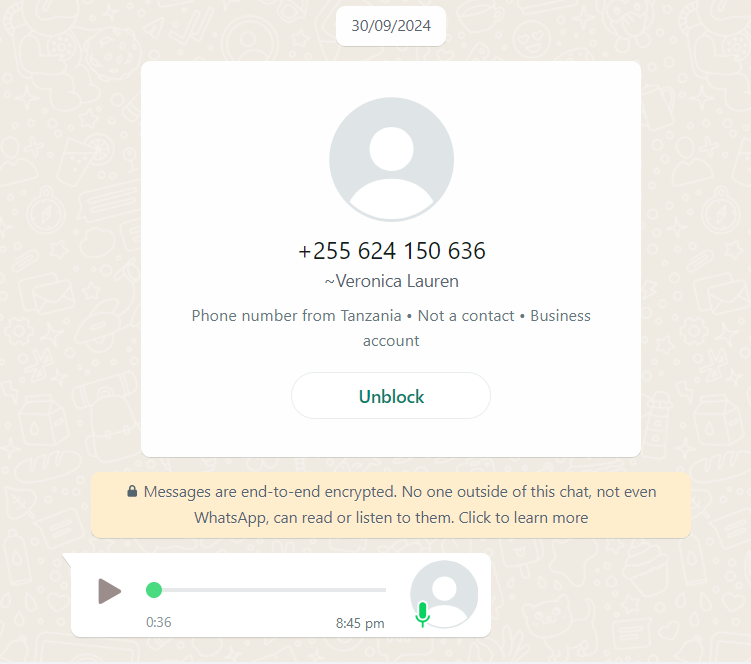 وفي نفس السياق، وضح العديد من مستخدمي منصات التواصل الاجتماعي ما حدث معهم: الموضوع بـ يبدأ بـ تسجيل صوتي يتم إرساله لك على تطبيق الواتس اب من رقم غير مصري، بـ صوت فتاة تقول لك: السلام عليكم يا فندم معاك آية سعيد محمد من إحدى الشركات الإلكترونية، ذاكرة اسم وهمي لشركة زاعمة أنها تتخصص في الأعمال والخدمات التكنولوجية.