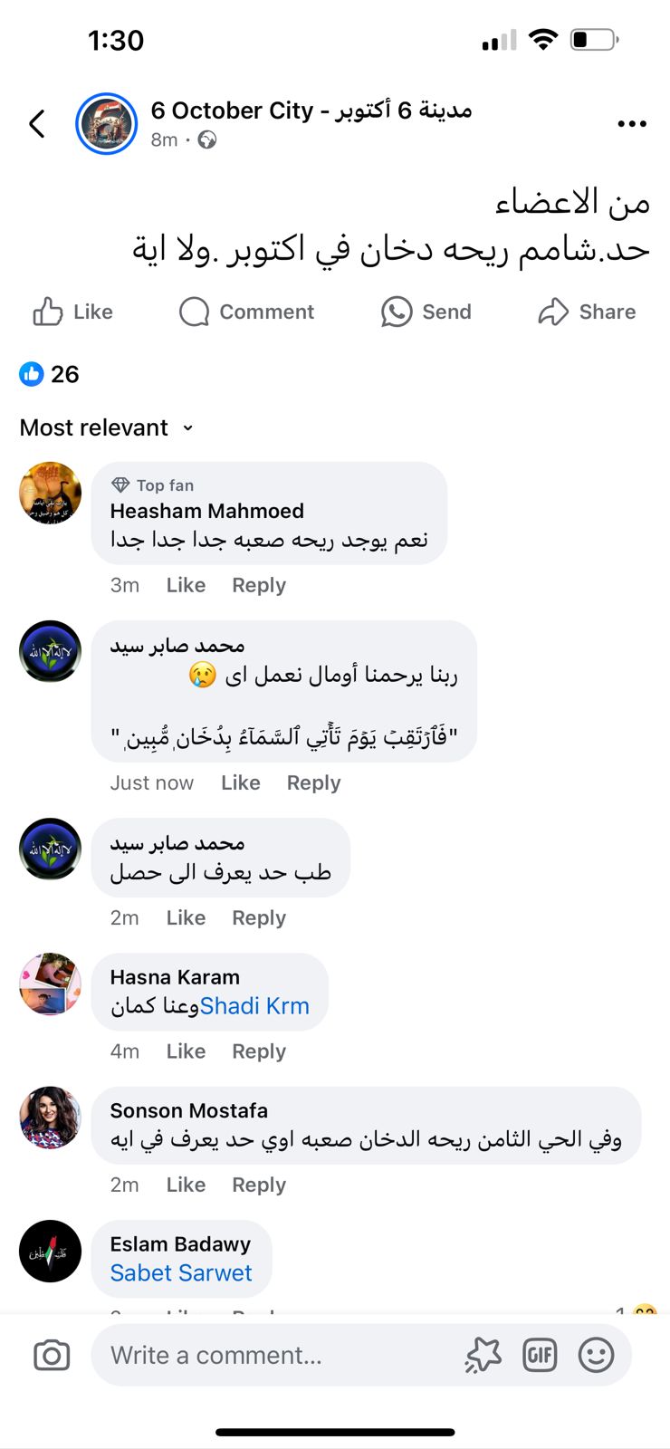 وأثار وجود الدخان في المنطقة قلق وخوف أهالي المنطقة، خاصة وأنه تسبب في صعوبة في التنفس لدى كبار السن والأطفال، وعلقوا قائلين: محدش عارف السبب، البعض بيقول عمليات رصف طرق وحرق مازوت، والبعض بيقول عمليات حرق قش رز في القرى المطلة على المحور.