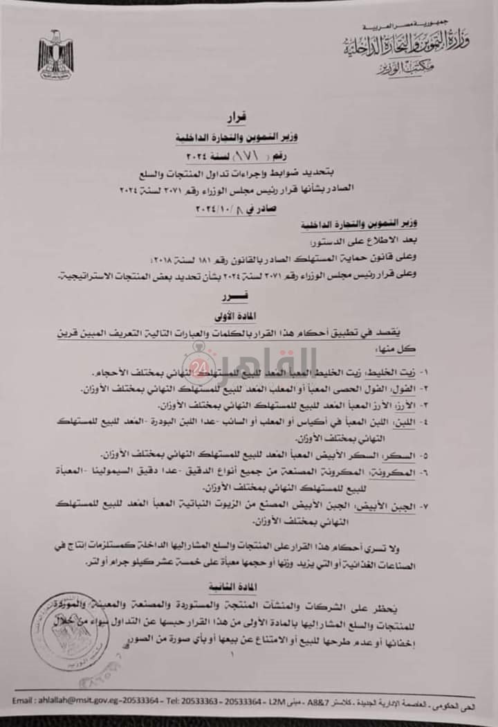 ونشر قرار وزير التموين والتجارة الداخلية، بالعدد الصادر اليوم من الجريدة الرسمية.