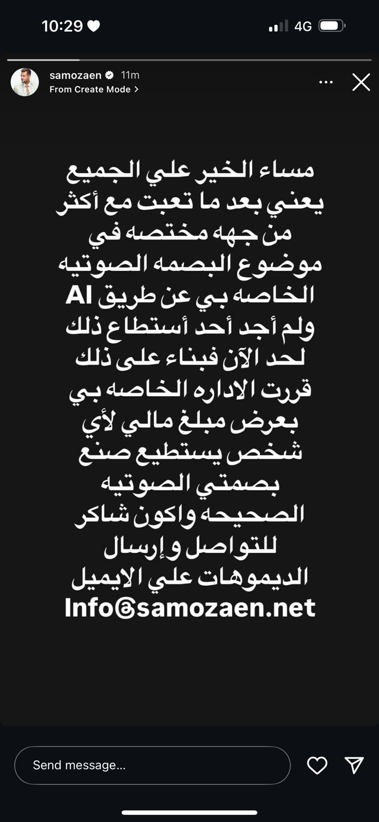 وأكد سامو زين في منشوره أن العديد من الجهات المختصة حاولت تقليد بصمة صوته الفريدة ولكنها فشلت، وقال سامو زين: جهات مختصة حاولت تعمل بصمتي بالذكاء الاصطناعي، بس معرفتش توصل لنفس الجودة، عشان كدة بعرض مبلغ محترم لأي حد يقدر يعملها.