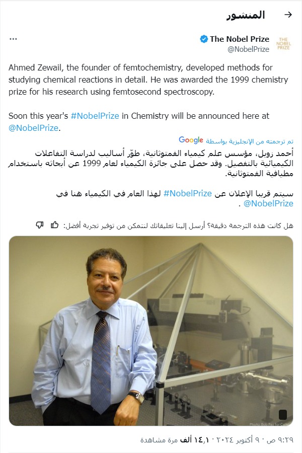 ومن خلال منشور رسمي عبر مواقع التواصل الاجتماعي، أعلن مسؤولو نوبل الاحتفال بالعالم المصري أحمد زويل، مؤسس علم كيمياء الفمتوثانية قبل إعلان الفائز بجائزة 2024، تقديرًا لمجهوداته العريقة في المجال العلمي، قائلة: في أواخر الثمانينات، طوَّر أحمد زويل الحائز على جائزة نوبل ومؤسس كيمياء الفيمتو طُرقًا لدراسة التفاعلات الكيميائية بالتفصيل.