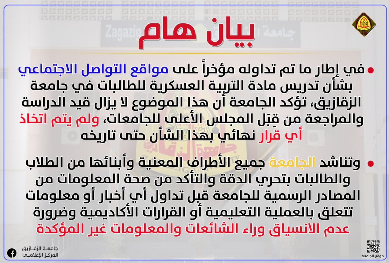أصدرت جامعة الزقازيق، بيانًا رسميًا بشأن ما تم تداوله مؤخرا على مواقع التواصل الاجتماعي، بشأن تدريس مادة التربية العسكرية للطالبات في جامعة الزقازيق.