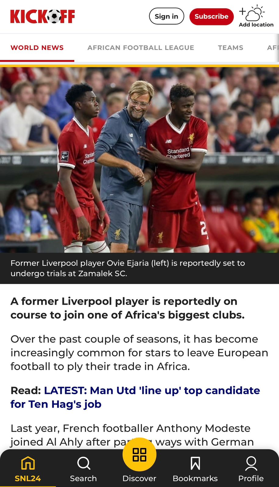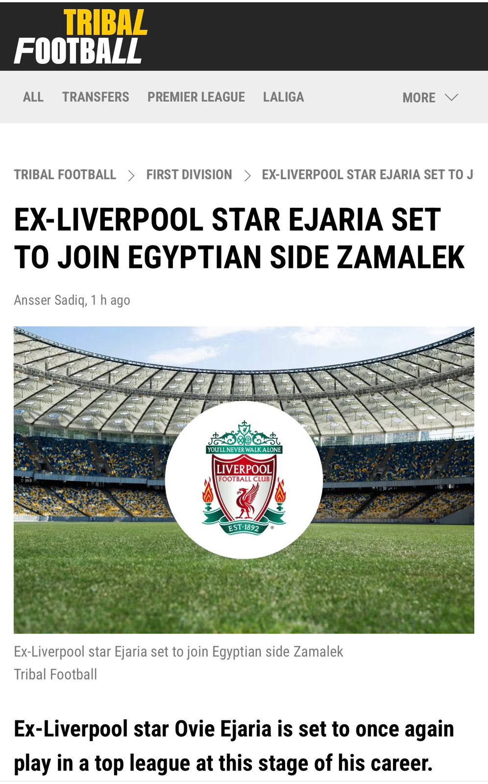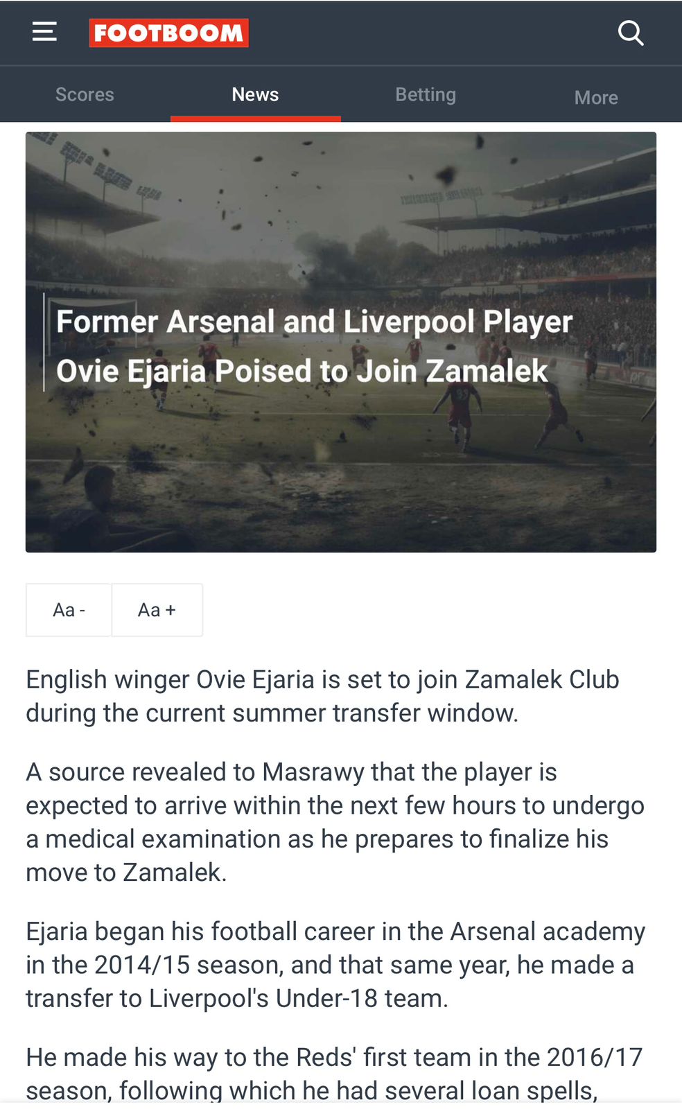 وقالت صحيفة فوت بوم، إن لاعب أرسنال وليفربول لسابق يقترب من الرحيل إلى نادي الزمالك، حيث تحدثت الصحيفة عن الأندية التي شارك فيها اللاعب في مسيرته الكروية في الفترة الأخيرة، كما أكدت أنه سيكون إضافة كبيرة لفريق الزمالك في حالة إتمام الصفقة.
