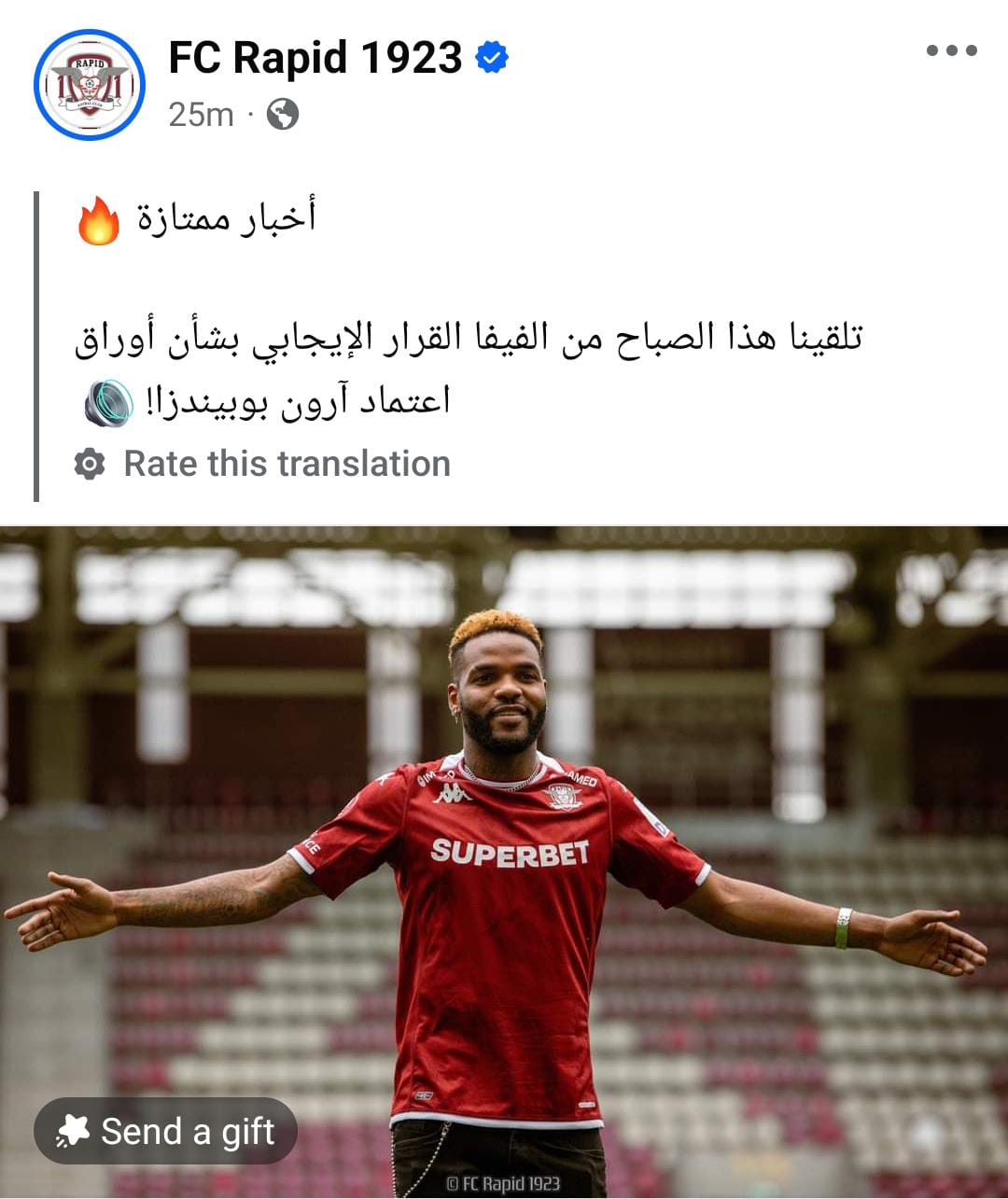 كشف نادي رابيد بوخارست الروماني بشكل رسمي، وجود قرار إيجابي من جانب الاتحاد الدولي لكرة القدم، فيفا، بشأن الجابوني آرون بوبيندزا صفقة النادي الجديدة.