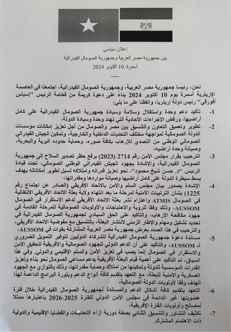 وأصدرت والصومال إعلانًا سياسيا مشتركا، حيث جاء البيان كالتالي: نحن رئيسا جمهورية مصر العربية، وجمهورية الصومال الفيدرالية، اجتمعنا في العاصمة الإريترية أسمرة يوم 10 أكتوبر 2024 بناء على دعوة كريمة من الرئيس "إسياس أفورقي" رئيس دولة إريتريا، واتفقنا على ما يلي: