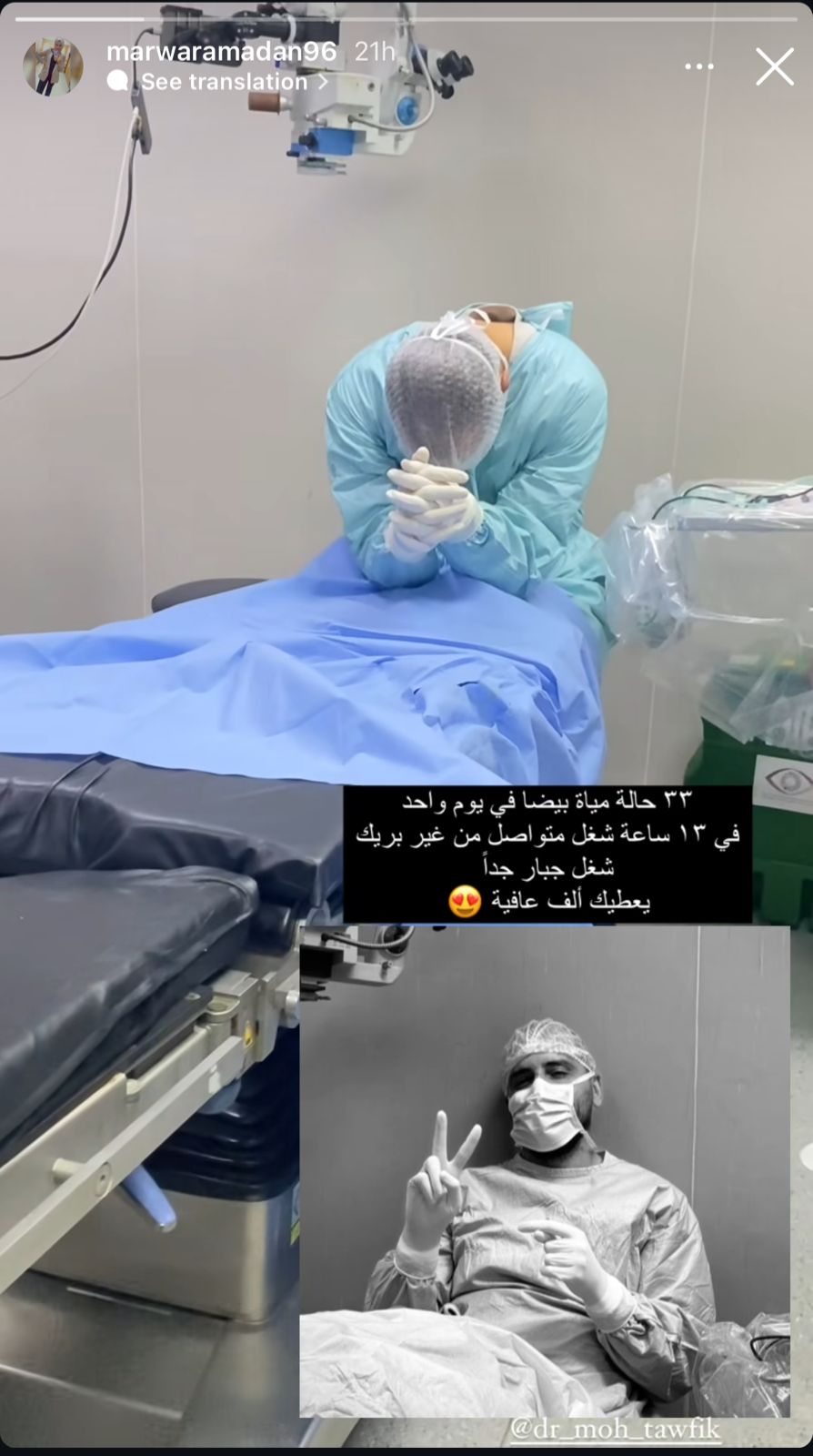 33 حالة مياه بيضاء في يوم واحد.. 13 ساعة شغل متواصل بدون راحة، شغل جبار، بتلك الكلمات نشرت طبيبة العيون الغزاوية مروة رمضان، صورة وفيديو للدكتور المصري محمد توفيق، عقب 13 ساعة من العمل المتواصل في إنقاذ أبصار مصابي غزة، والموجود في المستشفى الأوروبي بغزة، ويظهر فيها رافعًا علامة النصر مرتديًا قناعه الطبي.