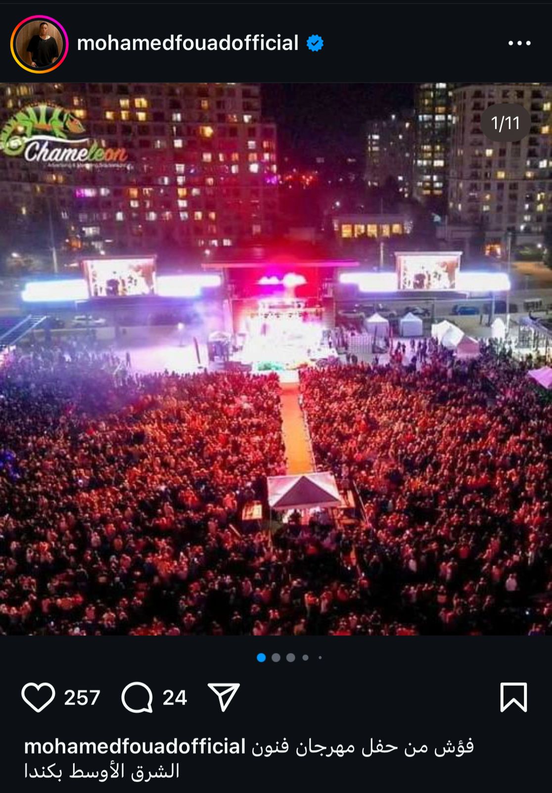 ونشر محمد فؤاد عبر حسابه الرسمي بـ موقع تبادل الصور والفيديوهات إنستجرام صورا من الحفل، وعلق عليها قائلًا: حفل مهرجان الشرق الأوسط بكندا.