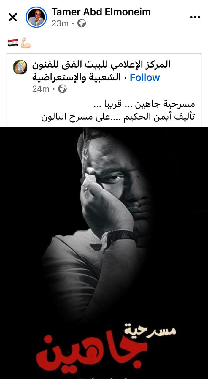 وأعاد الفنان تامر عبد المنعم نشره عبر حسابها الشخصي بموقع فيسبوك، مؤكدًا أن مشروع مسرحية عن صلاح جاهين سيقام على مسرح البالون قريبا، دون الكشف عن التفاصيل.