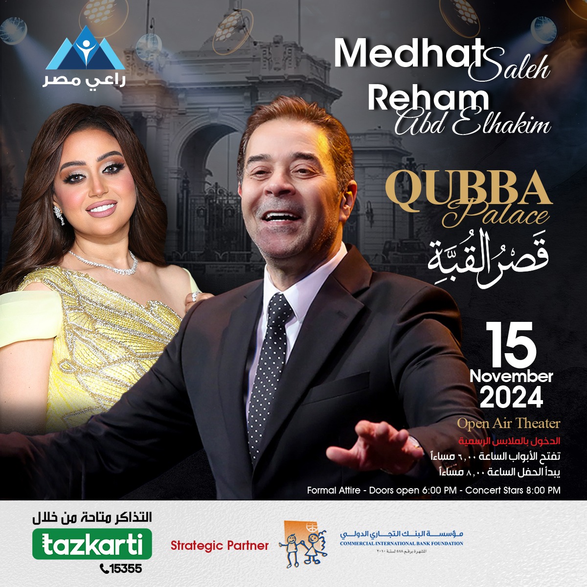 يحيي الفنان مدحت صالح والفنانة ريهام عبد الحكيم، حفلا غنائيا بمصاحبة الأوركسترا المصاحبة لهما، يوم الجمعة الموافق 15 نوفمبر المقبل، في الحديقة الملكية بقصر القبة الرئاسي، والذي تنظمه مؤسسة راعي مصر للتنمية عضو التحالف الوطني للعمل الأهلي التنموي.