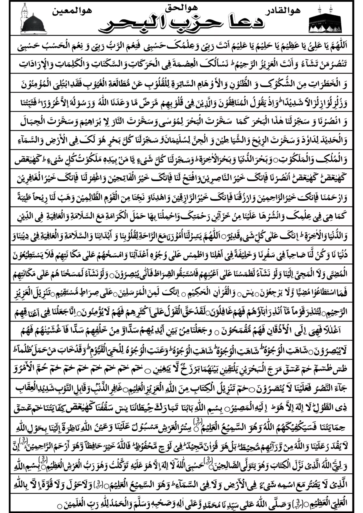 دعاء حزب البحر هو أحد الأدعية الصوفية المعروفة، ويرتبط ارتباطًا وثيقًا بالإمام أبي الحسن الشاذلي. يحكي الرواة أن الإمام الشاذلي رأى النبي صلى الله عليه وسلم في المنام، وهذا الدعاء يردد خلال رحلة بحرية تعرضت لعاصفة قوية توقفت خلالها الرياح. وبفضل هذا الدعاء، عادت الرياح ونجت السفينة.