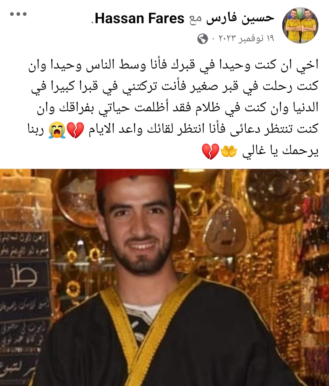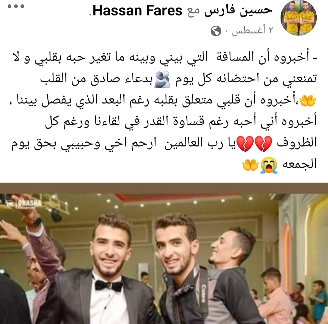 وأوضح أن حسن توفاه الله، منذ عامين وترك خلفه توأمه حسين يغمره الحزن والحنين، لم يتوقف حسين عن نشر ذكريات ومشاعر الفراق يوميًا، وكأن قلبه ما عاد يحتمل العيش بدونه، واليوم، حسين لحق بتوأمه حسن ليجتمعا من جديد في رحاب الله، ربنا يرحمهما ويجمعهما في الجنة كما كانوا في الدنيا، لا يفرقهما شيء، اللهم اربط على قلوب أهلهما وأحبائهما.