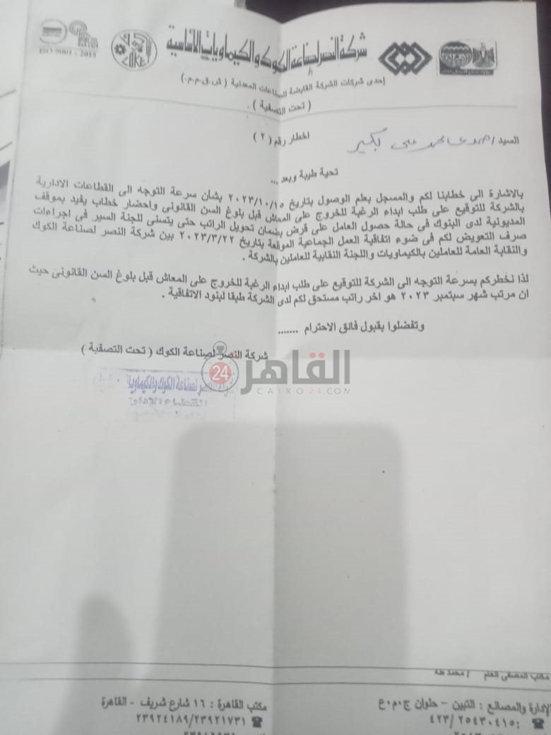 عامل بشركة الكوك يستغيث بوزير العمل: مش بقبض بقالي سنة.. وأرغب في نقلي لمكان آخر