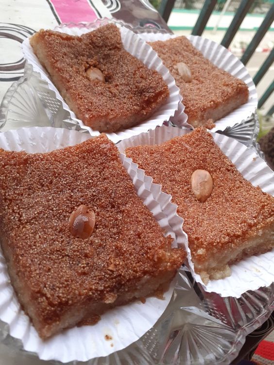 - بعد مرور ساعة إلى ساعتين قومي بتقطيع البسبوسة ورصيها في أطباق التقديم وزينيها بالمكسرات وبألف هنا بسبوسة زي المحلات.