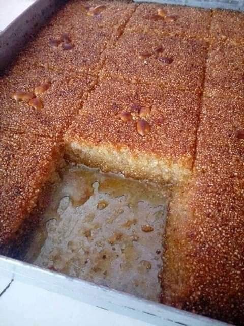 - صبي الشربات على البسبوسة الساخنة وهو ساخن وقدميها بسبوسة مرملة ولذيذة.
