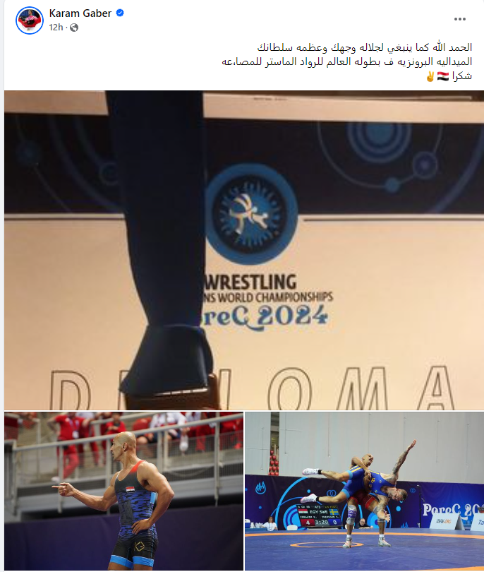 كتب كرم جابر عبر حسابه الشخصي على فيسبوك: الحمد الله كما ينبغي لجلالة وجهك وعظمه سلطانك، الميداليه البرونزيه في بطوله العالم للرواد الماستر للمصارعة.
