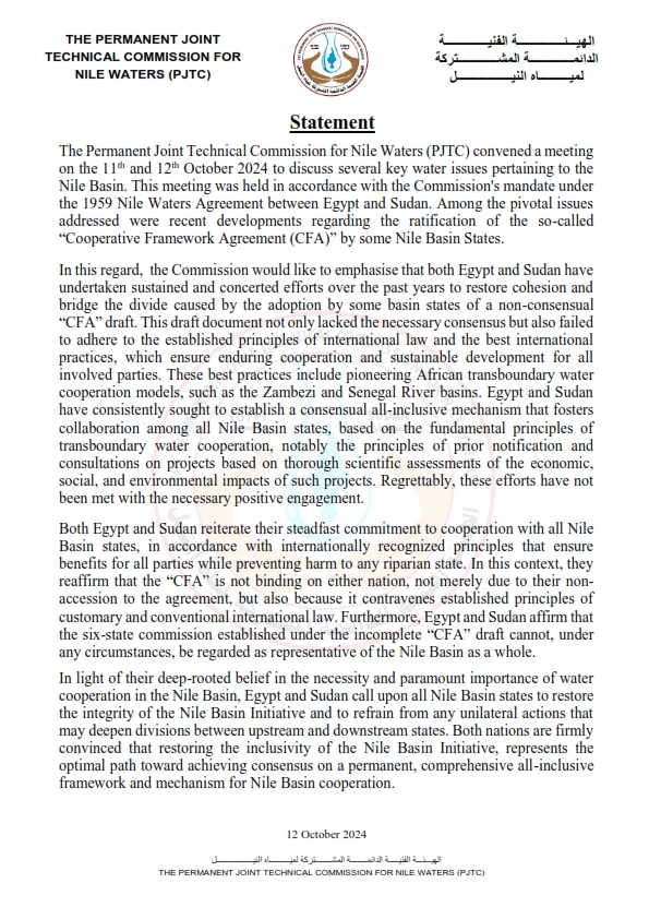 وجدد الجانبان، في بيان، التزامهما الكامل بالتعاون مع دول حوض النيل في إطار المبادئ المتعارف عليها دوليًا والتي تحقق المنفعة للجميع دون أحداث ضرر لأي من الدول، فإنهما تؤكدان أن ما يسمى بالاتفاق الإطاري للتعاون في حوض النيل CFA غير ملزم لأي منهما، ليس فقط لعدم انضمامهما إليه وإنما أيضا لمخالفته لمبادئ القانون الدولي العرفي والتعاقدي، كما تشددان على أن مفوضية الست دول الناشئة عن الاتفاق الإطاري غير المكتمل لا تمثل حوض النيل في أي حال من الأحوال.