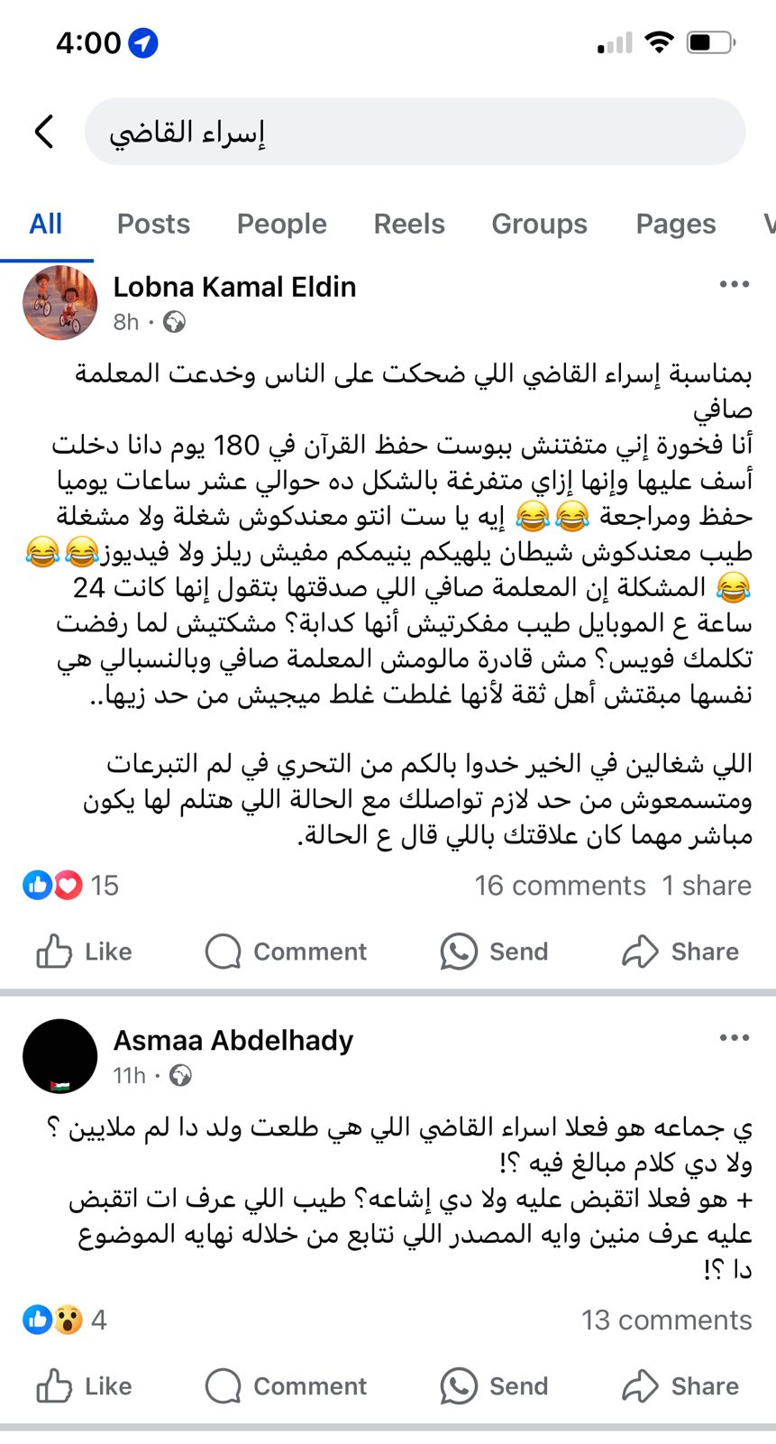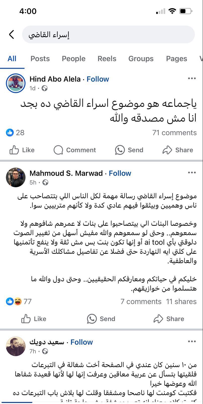 كما قال غيرهم: موضوع إسراء القاضي ده رسالة لكل اللي بيصاحبوا ناس وهمية، كانت بتدعي أن لديها مجموعات لمساعدة الفتيات نفسيًا وماليًا.